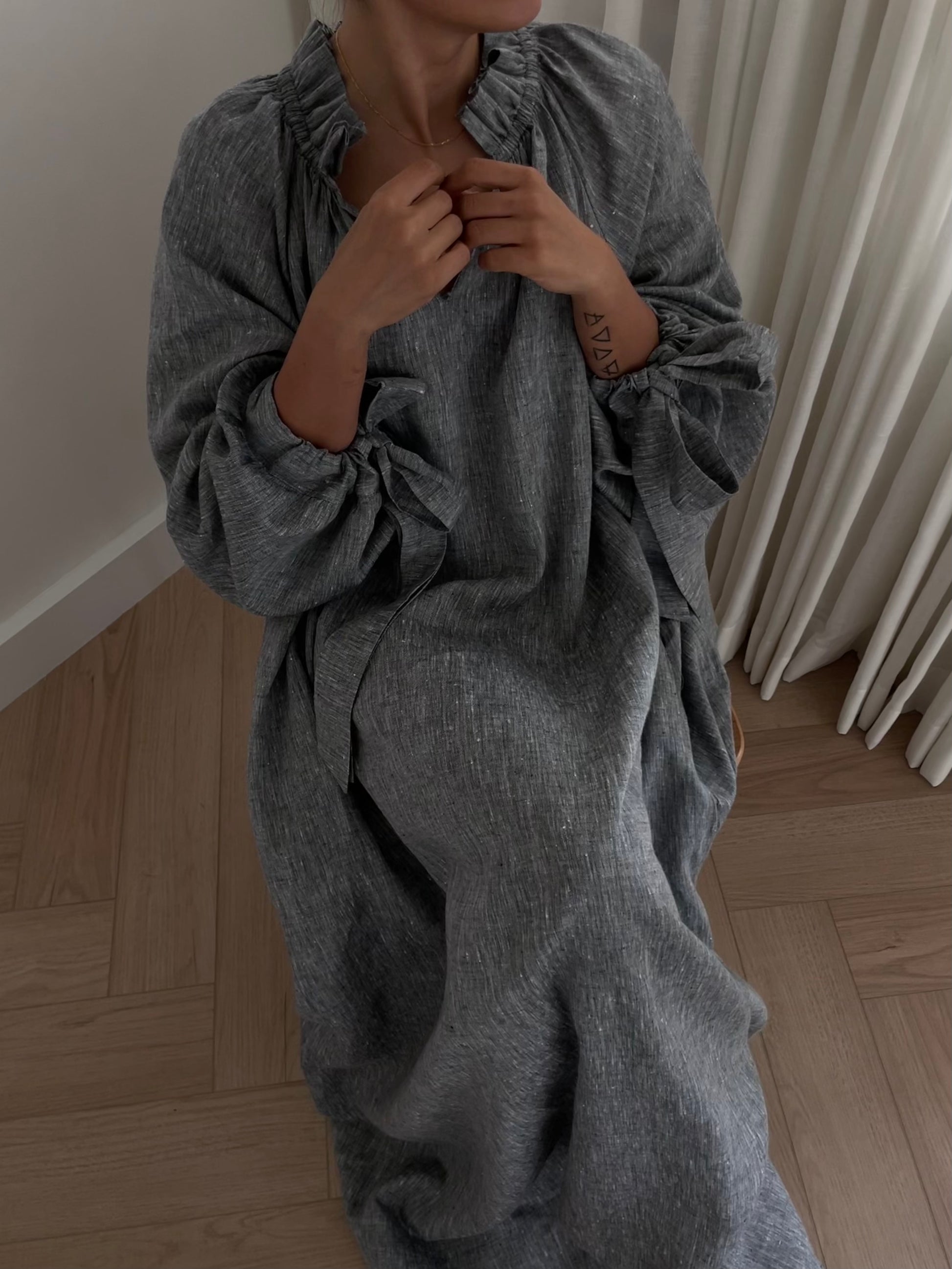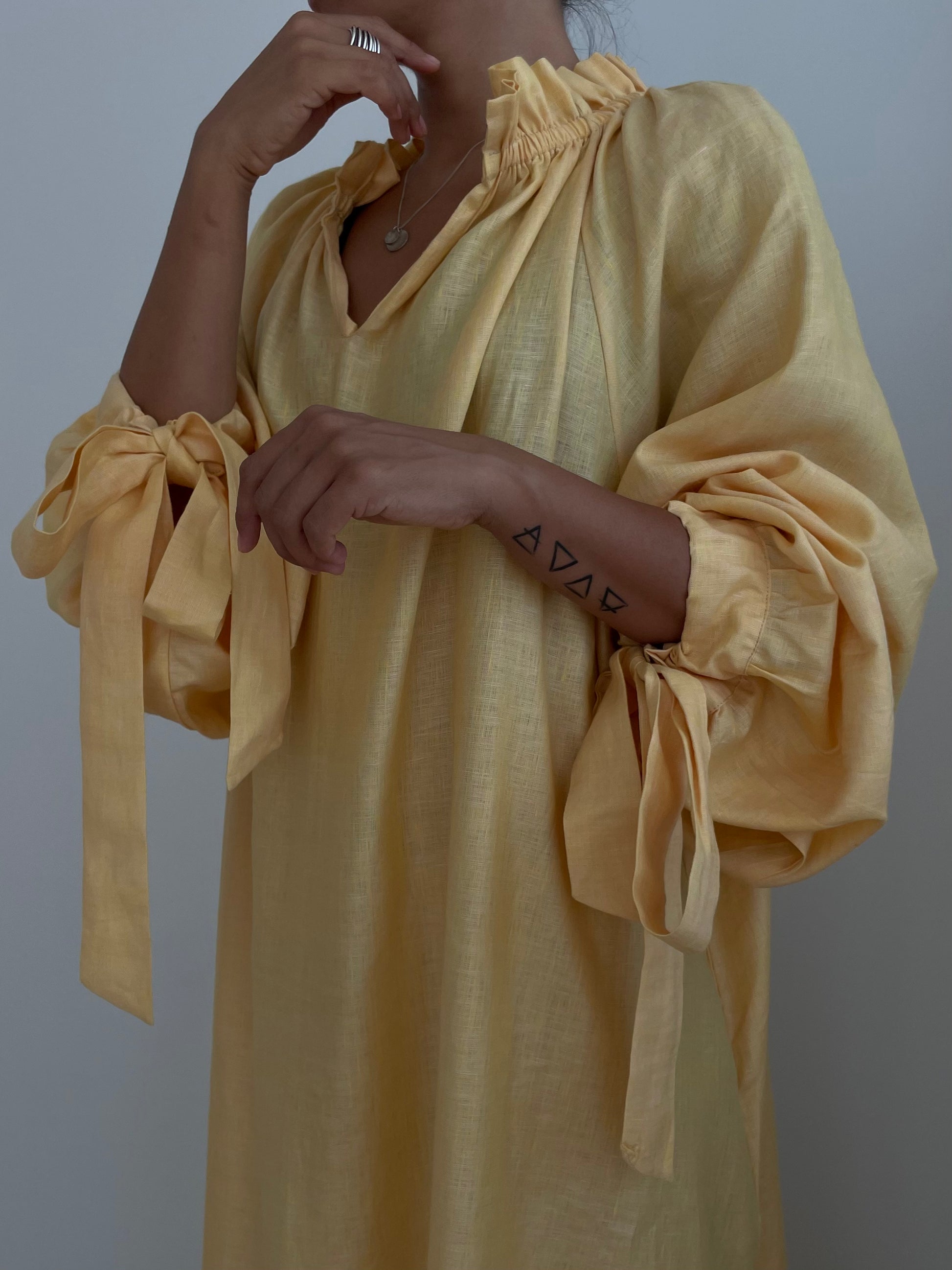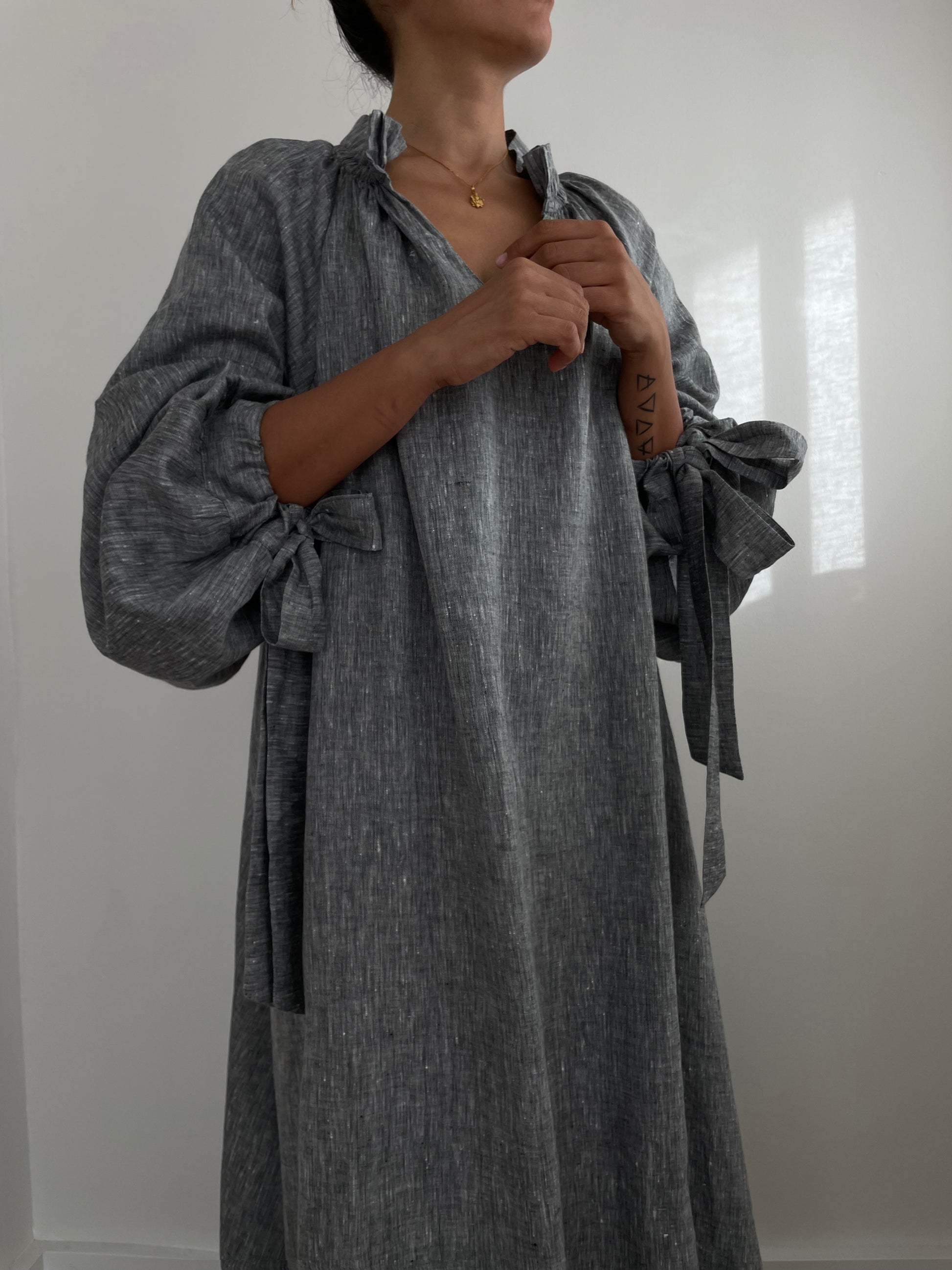 - Long sleeves with tie cuffs